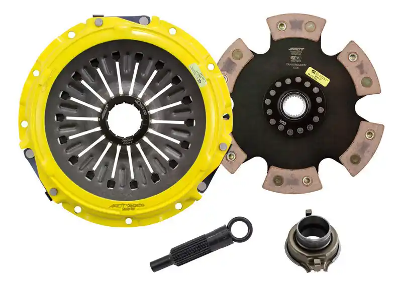 Moderate to heavy pedal effort, aggressive engagement, increased gear rattle, confidence during hard shifts; Moderate friction life, extended by ACT’s exclusive diaphragm design, dramatic improvement in release mechanism life, rigid design may increase spline wear; Carefully engineered, precisely assembled, accurately balanced, uses select ceramic friction materials for high heat tolerance and maximum performance, major improvement in release mechanism; Recommended for race use only; 100% clamp load tested and dynamically computer balanced for smooth high RPM reliability, includes ACT’s patented Monoloc