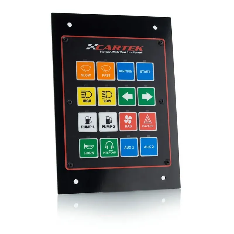 The CARTEK Power Distribution Panel is a fully integrated, fully electronic solution to power distribution in race and rally cars. Designed to replace 16 Fuses, Relays and Switches as well as a variety of control systems, these units therefore greatly simplify the wiring, reducing build time, saving weight and maximising reliability.