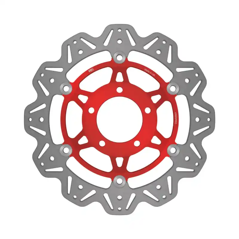 EBC Brakes™ Vee-Rotors™ Replacement Discs are British made discs using German mill rolled precision stainless steel rotor blades with a VEE profile weight reducing profile mounted onto lightweight alloy center hubs, using the patented SD square drive button technology.