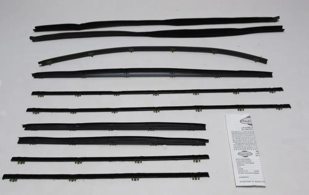 A window sweep kit is a set of replacement seals for classic car doors and windows. These sweeps help keep out water, dust, and wind while allowing the window glass to move smoothly. Replacing worn sweeps restores proper sealing, reduces interior noise, and protects door panels from moisture damage.