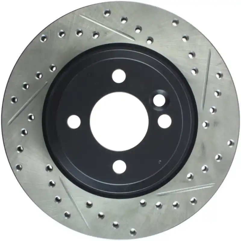 StopTech Drilled and Slotted Sport Rotors are 1-piece direct replacement brake discs for factory brake systems and stock calipers that look great behind your wheels – and offer significantly improved braking performance. The unique cross-drilling and slotting aids with heat and brake dust dispersal; prevents glazing of the pads; adds bite and improves wet and dry braking performance. Built to last; the black e-coating provides protection from corrosion and the high carbon metallurgy (in most applications) offers quieter operation; better crack resistance and increased performance.